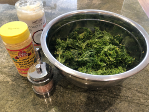 3. Place kale in a large bowl and evenly distribute the oil across the kale by massaging with clean hands.