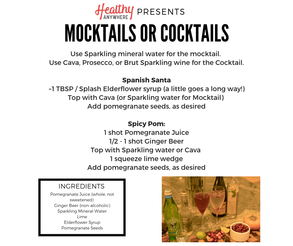 Just a touch of organic Elderflower Syrup in sparkling mineral water.. or Cava is wonderful. Add a few pomegranate seeds for some holiday flair… and polyphenols