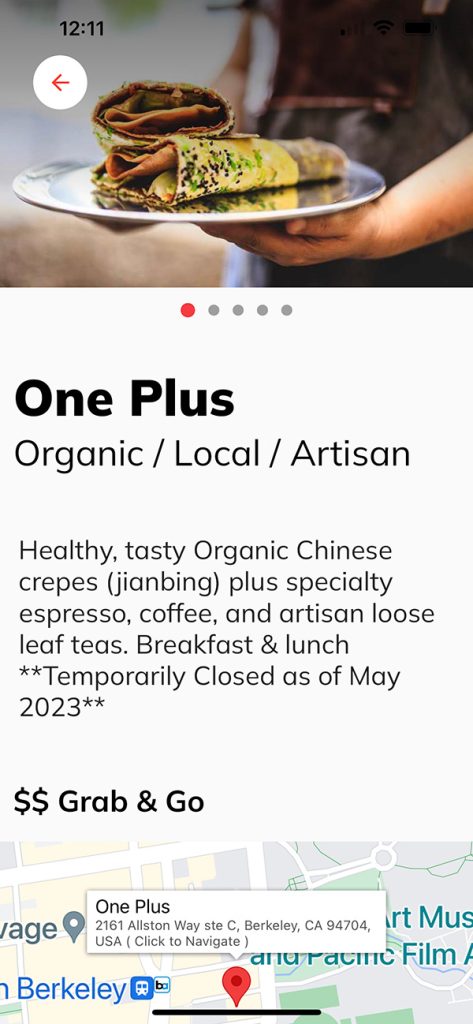 How Temporary Closures appear in the Healthy Anywhere App. 👆(Note the **…**) This one’s closed for Summer 2023, but never fear Berkeley: One Plus’s Organic jianbing will return in Fall!